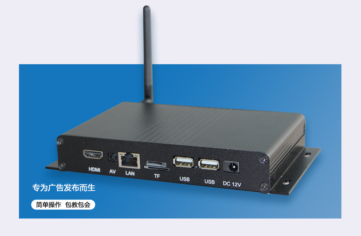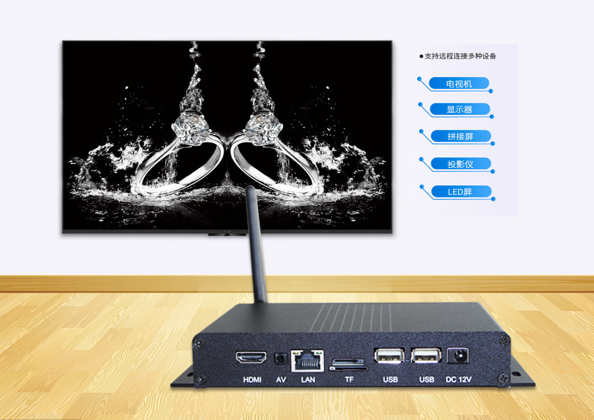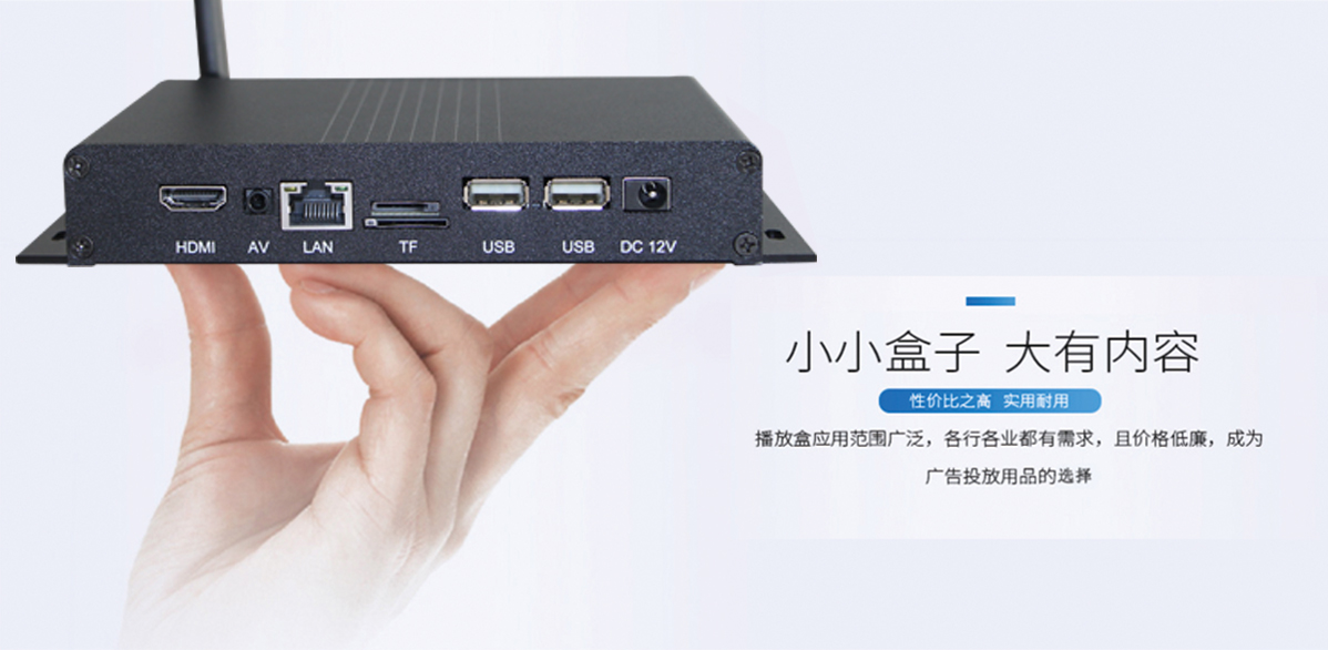 兼容多种播放设备,播放盒能使普通的电视机等显示设备,瞬间变身成为广告机数字标牌