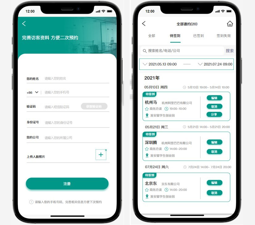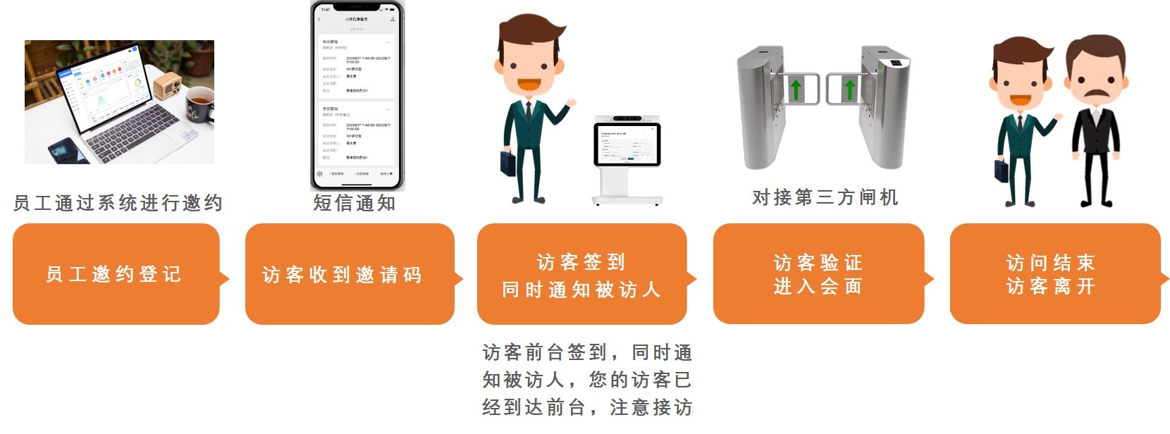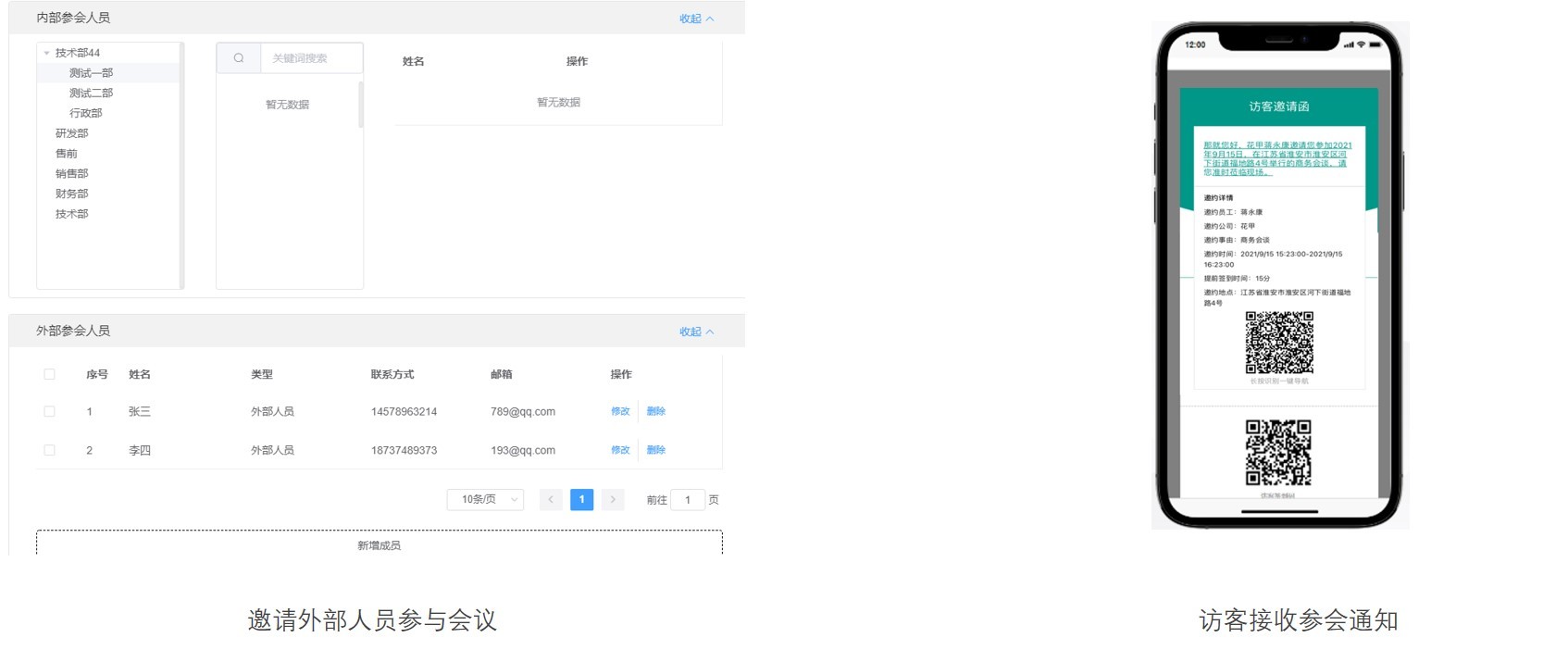 访客系统可与会议预定系统同平台使用,发起会议时,选择外部人员进行邀约,系统自动生成访客邀约信息通知参会人,参会人可通过邀约通知,前往现场即可参与会议。