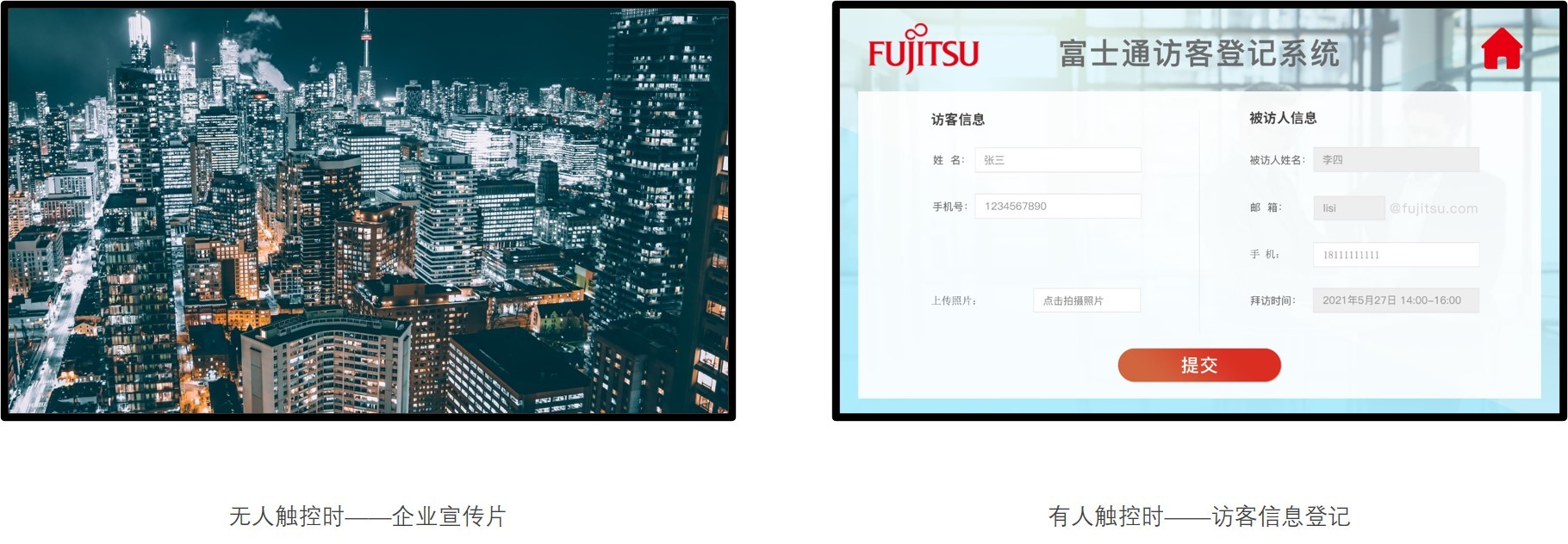 访客系统可与信息发布系统联动使用,无人触摸时播出企业宣传片、企业资讯等信发节目,当有人触摸后可在屏幕上进行访客登记。