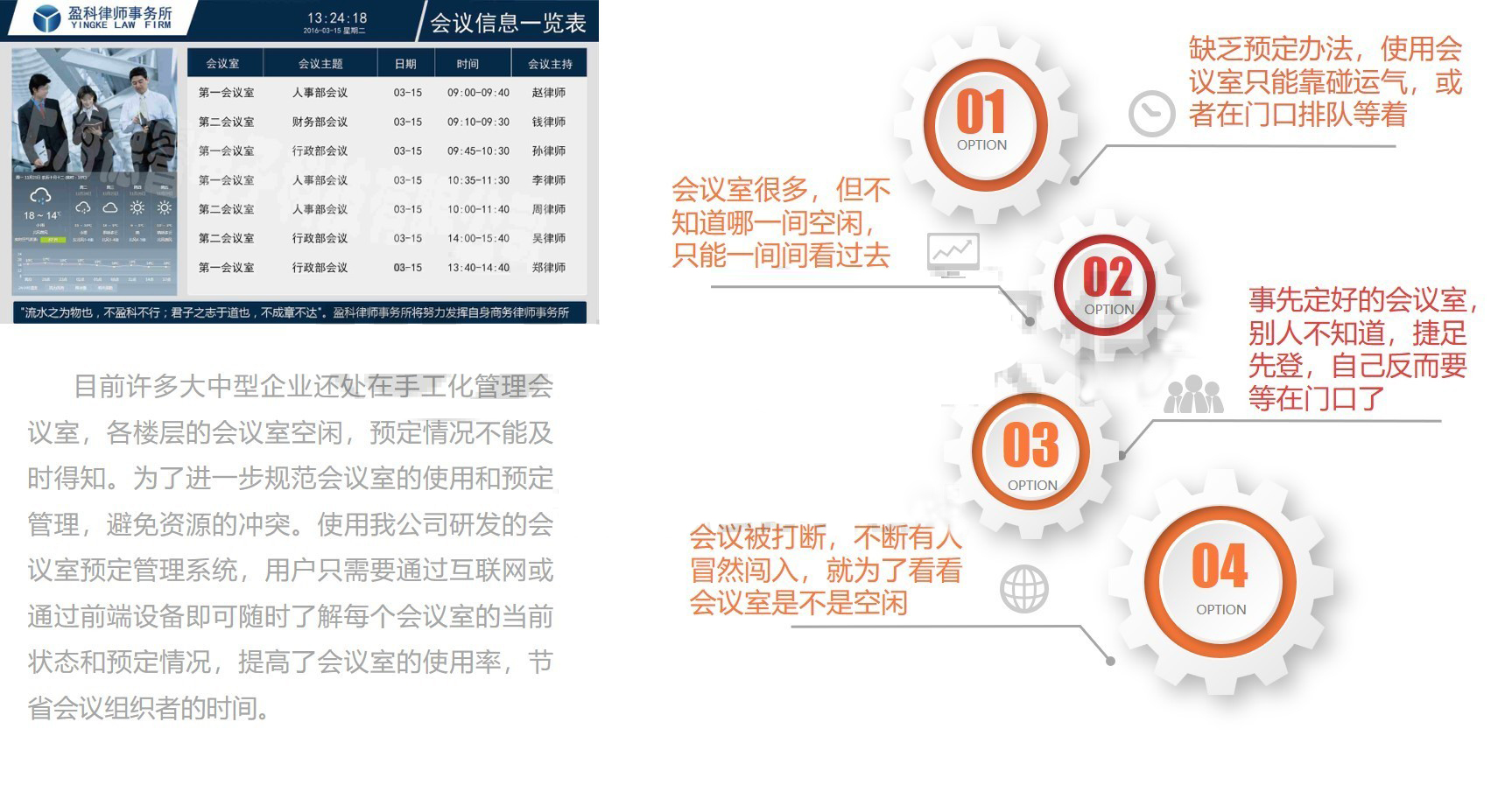 据统计,企业每位员工平均每天浪费15-20分钟在寻找一个合适的空间洽谈或者会议。今天的企业面对的增长压力是空前绝后的,员工对于会议的需求呈指数上升。一套会议预定系统能够有效利用会议室资源,按照中国目前办公区域地租水平,一年能为企业带来数十万费用支出。员工节省的时间成本更是无法用金钱衡量。