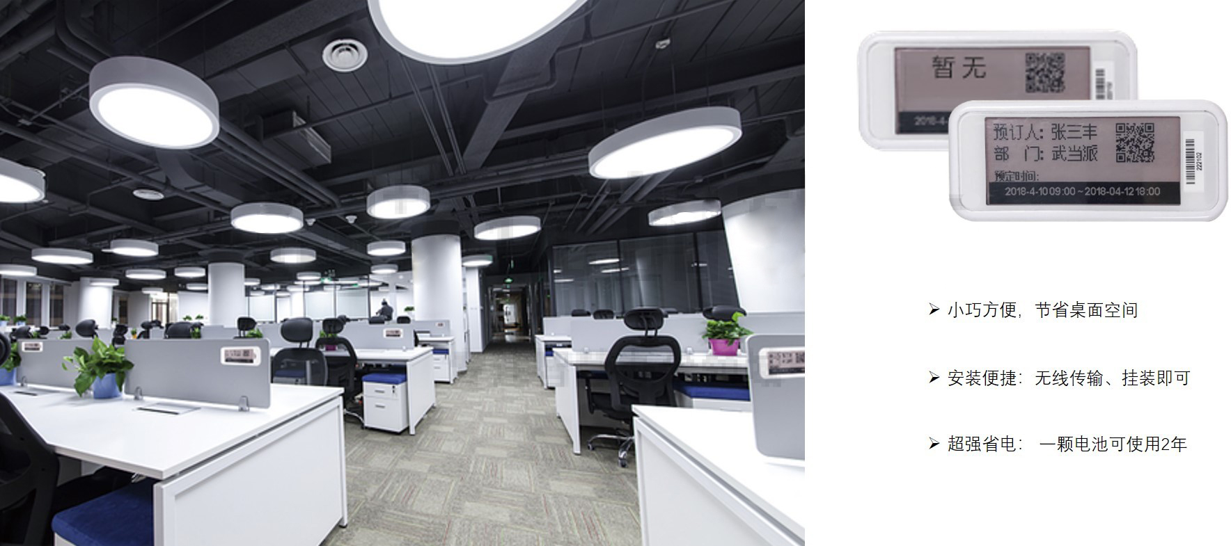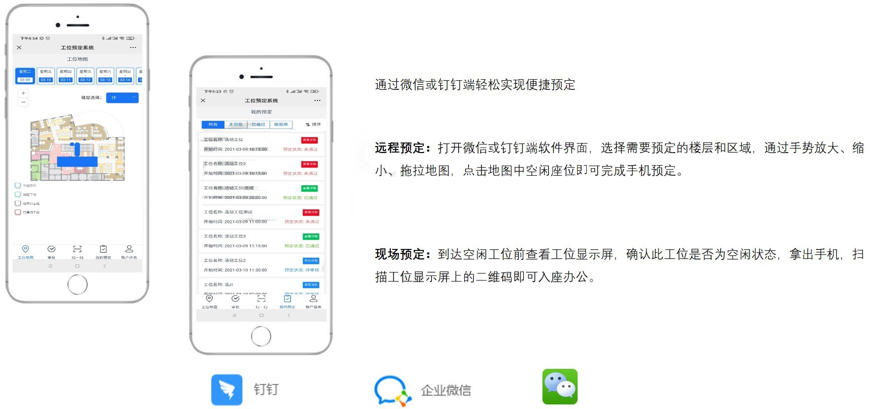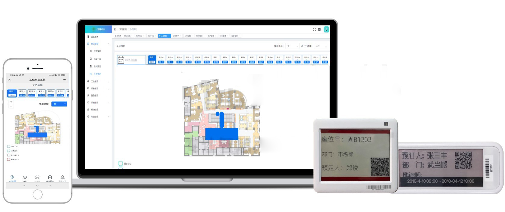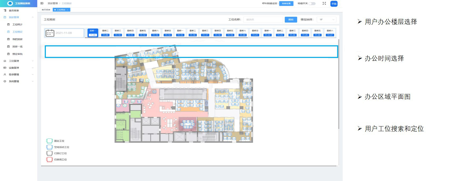 管理员可在PC端给员工绑定固定工位,同时,用户也可在PC、微信端上发起工位预定,信息将自动显示至工位显示屏上,也可通过工位预定屏扫码快速发起预定。