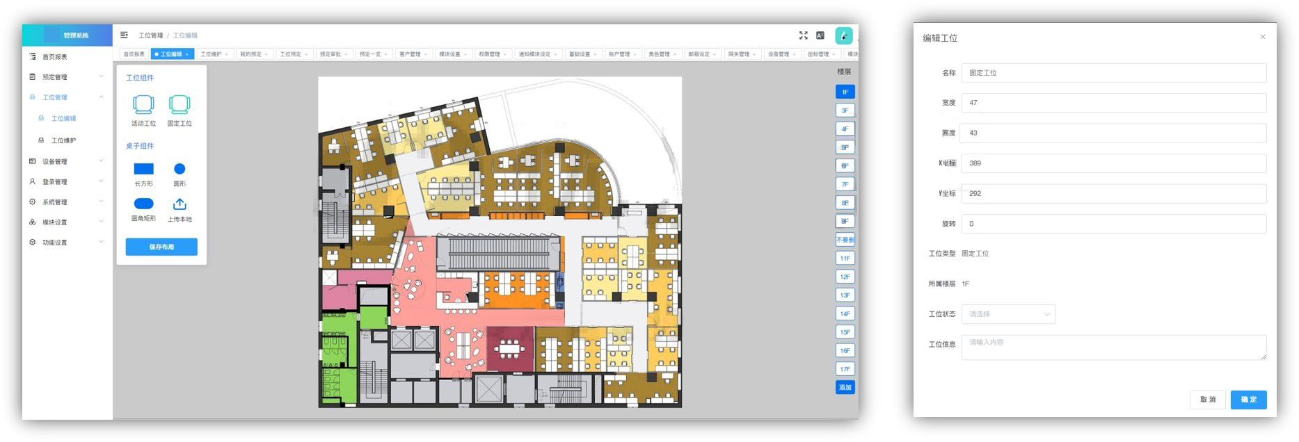 管理员可以根据实际情况灵活的更新和维护办公区域布局,编辑工位状态。自行添加工位组件和桌子组件