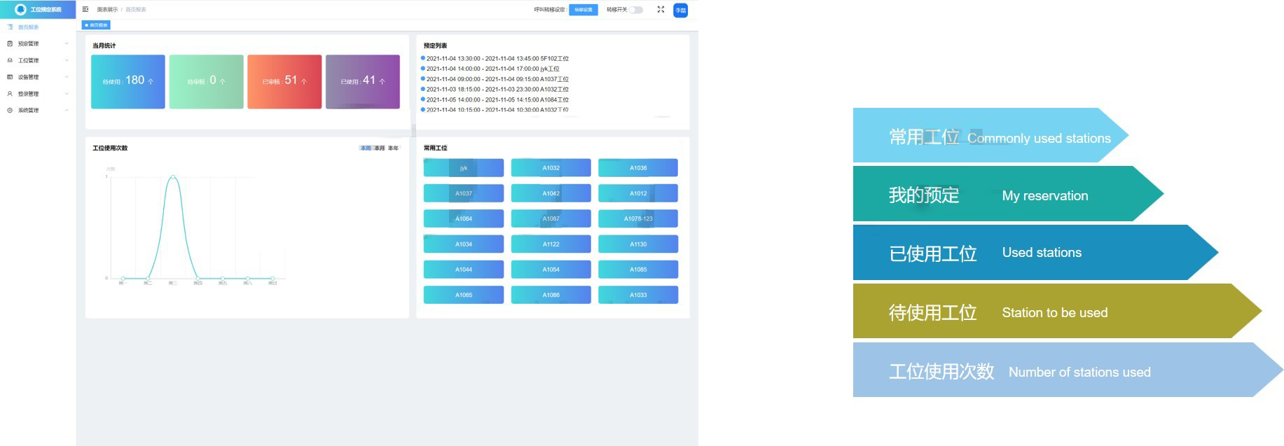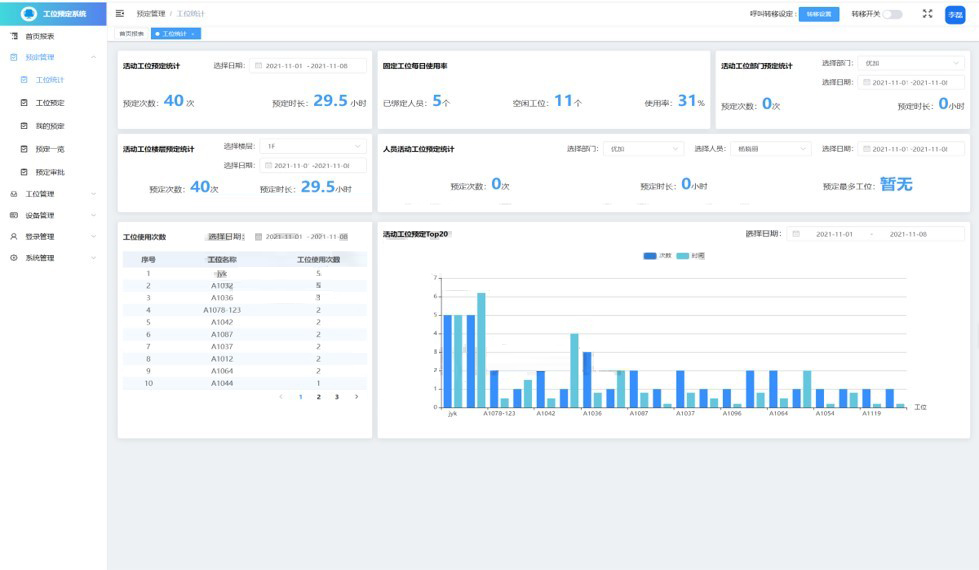 系统后台自动对工位的预定情况进行统计,并生成统计报表,使工位的使用情况一目了然,方便管理者后续对工位办公资源进行合理的规划。